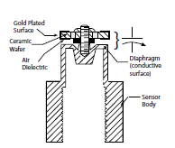 The diaphragm is constructed of a low-hysteresis material such as 17-4 PH SS or a proprietary compound of fused glass and ceramic (Setraceram). These firmly secured surfaces (or plates) are mounted so that a slight mechanical flexing of the assembly, caused by a minute change in applied pressure, alters the gap between them (creating, in effect, a variable capacitor). The resulting change in capacitance is detected by a sensitive linear comparator circuit (employing proprietary custom designed ASICs), which amplifies and outputs a proportional, high level signal.